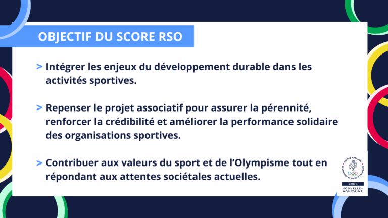 Pour une organisation sportive, la RSO va bien au-delà du développement durable : elle permet de repenser le projet associatif, de structurer une stratégie durable, de contribuer au développement du sport et de faire vivre les valeurs du sport et de l’olympisme, tout en répondant aux attentes de la société.